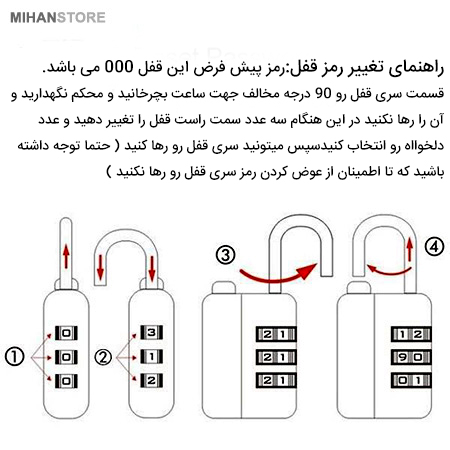 رمز پیش فرض این قفل 000 می باشد. قسمت سری قفل رو 90 درجه مخالف جهت ساعت بچرخانید و محکم نگهدارید و آن را رها نکنید  در این هنگام سه عدد سمت راست قفل را تغییر دهید و عدد دلخوااه رو انتخاب کنید سپس میتونید سری قفل رو رها کنید (حتما توجه داشته باشید که تا اطمینان از عوض کردن رمز سری قفل رو رها نکنید)
