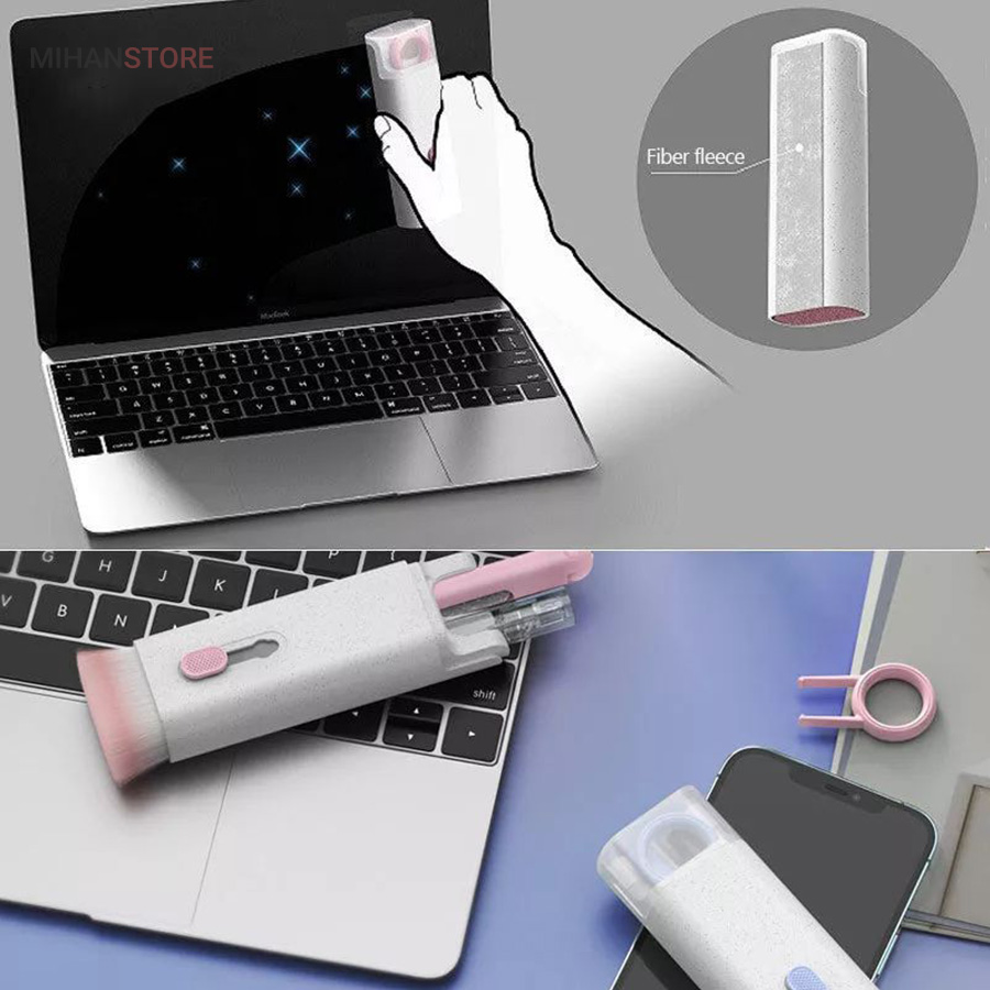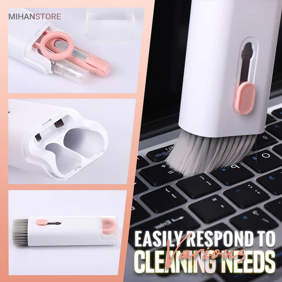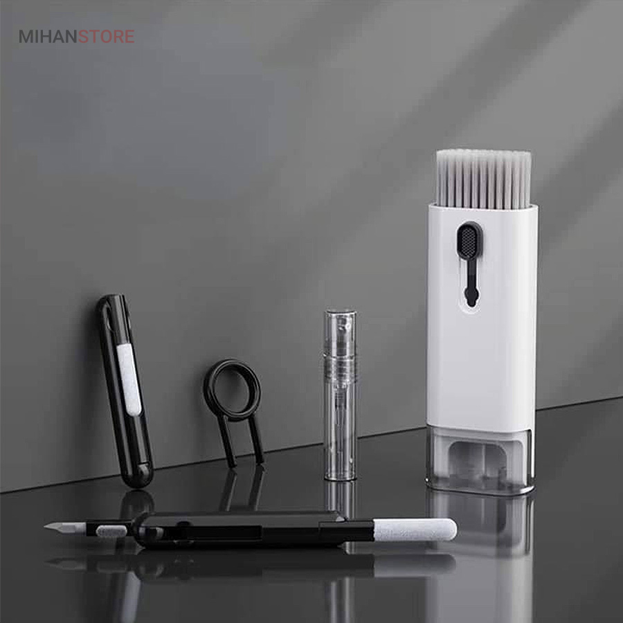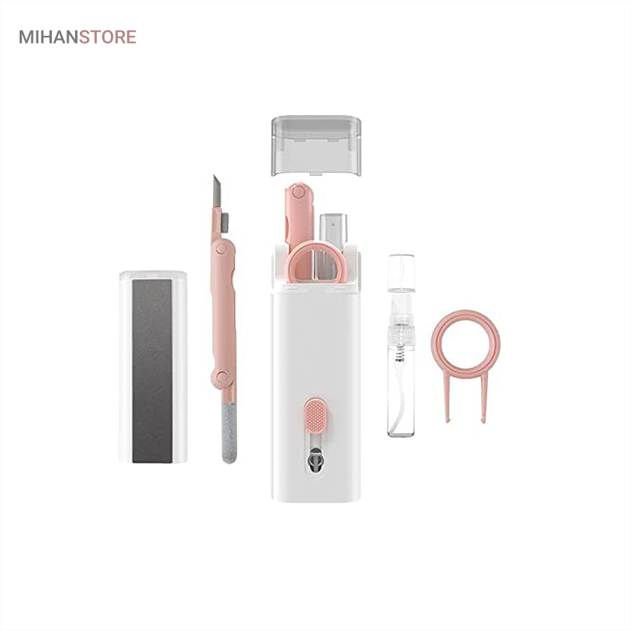 این کیت تمیزکننده 7 کاره شامل 1 برس بزرگ با تراکم بالا، 1 عدد پد تمیز کننده فیبری (مخصوص سطوح مانند مانیتور) ، 1 قلم تمیز کننده گوشی (شامل نوک فلزی، اسفنج و مینی برس با چگالی بالا)، 1 عدد کلیدکش کیبورد و 1 بطری اسپری می باشد. این سرویس پاک کننده چند منظوره می تواند هر خواسته شما را برای تمیز کردن وسایل الکترونیکی برآورده کند. اولین ابزار یک خودکار تمیزکننده تاشو با نوک سیلیکونی، برس کوچک سخت و اسفنج جمع‌کننده کثیفی ها ، مناسب برای تمیز کردن ایرپاد و سایر هدفون‌ها یا هندزفری ها. نوک سیلیکونی برای تمیز کردن لکه های شکاف است. دومین ابزار برس کوچک برای تمیز کردن گرد و غبار سطوح عمیق و اسفنج دسته دار برای تمیز کردن حفره های کیس شارژ  ایرپاد ها می‌باشد. ابزار سوم تمیز کننده لپ تاپ، رایانه، تبلت و صفحه کلید می باشد کافیست برس نرم بزرگ را بکشید تا گرد و غبار روی رایانه، لپ تاپ، تبلت و صفحه کلید پاک شود. و همچنین می توانید از کلیدکش کیبورد جدا کردن کلیدهای صفحه کلید مکانیکی برای انجام این کار استفاده کنید. ابزار بعدی تمیز کننده مانیتور، صفحه نمایش، دوربین، ساعت و تلویزیون میباشد: در کنار یک بطری خالی اسپری 5 میلی‌لیتری، مایع تمیزکننده یا آب را درون بطری قرار می‌دهید و از صفحه فیبری برای تمیز کردن صفحه‌های مختلف استفاده می‌کنید. به عنوان مثال صفحات نمایش ، تلویزیون، ساعت، دوربین و غیره.اندازه جمع و جور و سبک وزن: 7 ابزار تمیز کردن کامپیوتر به طور مرتب در یک جعبه مستطیلی قرار گرفته اند. اندازه کیت پاک کننده فقط 4.88 * 1.73 * 1.18 اینچ و وزن آن تقریبا 80 گرم است. برای سفر به اندازه کافی کوچک است و می توانید آن را حمل کنید. در همین حال، شما همچنین می توانید هر ابزار تمیز کننده ای را به طور جداگانه بیرون بیاورید.