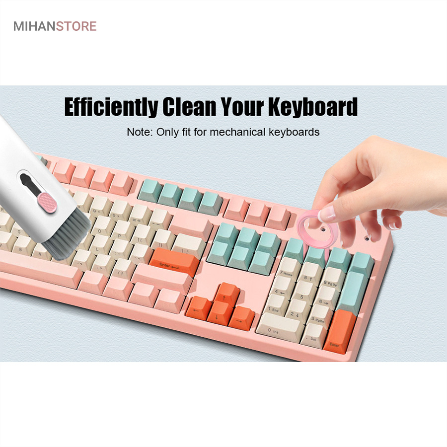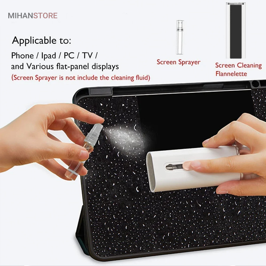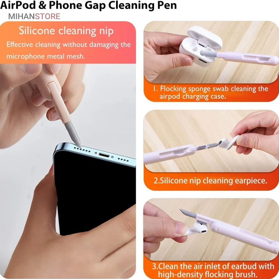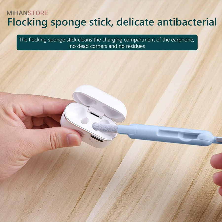 این کیت تمیزکننده 7 کاره شامل 1 برس بزرگ با تراکم بالا، 1 عدد پد تمیز کننده فیبری (مخصوص سطوح مانند مانیتور) ، 1 قلم تمیز کننده گوشی (شامل نوک فلزی، اسفنج و مینی برس با چگالی بالا)، 1 عدد کلیدکش کیبورد و 1 بطری اسپری می باشد. این سرویس پاک کننده چند منظوره می تواند هر خواسته شما را برای تمیز کردن وسایل الکترونیکی برآورده کند. اولین ابزار یک خودکار تمیزکننده تاشو با نوک سیلیکونی، برس کوچک سخت و اسفنج جمع‌کننده کثیفی ها ، مناسب برای تمیز کردن ایرپاد و سایر هدفون‌ها یا هندزفری ها. نوک سیلیکونی برای تمیز کردن لکه های شکاف است. دومین ابزار برس کوچک برای تمیز کردن گرد و غبار سطوح عمیق و اسفنج دسته دار برای تمیز کردن حفره های کیس شارژ  ایرپاد ها می‌باشد. ابزار سوم تمیز کننده لپ تاپ، رایانه، تبلت و صفحه کلید می باشد کافیست برس نرم بزرگ را بکشید تا گرد و غبار روی رایانه، لپ تاپ، تبلت و صفحه کلید پاک شود. و همچنین می توانید از کلیدکش کیبورد جدا کردن کلیدهای صفحه کلید مکانیکی برای انجام این کار استفاده کنید. ابزار بعدی تمیز کننده مانیتور، صفحه نمایش، دوربین، ساعت و تلویزیون میباشد: در کنار یک بطری خالی اسپری 5 میلی‌لیتری، مایع تمیزکننده یا آب را درون بطری قرار می‌دهید و از صفحه فیبری برای تمیز کردن صفحه‌های مختلف استفاده می‌کنید. به عنوان مثال صفحات نمایش ، تلویزیون، ساعت، دوربین و غیره.اندازه جمع و جور و سبک وزن: 7 ابزار تمیز کردن کامپیوتر به طور مرتب در یک جعبه مستطیلی قرار گرفته اند. اندازه کیت پاک کننده فقط 4.88 * 1.73 * 1.18 اینچ و وزن آن تقریبا 80 گرم است. برای سفر به اندازه کافی کوچک است و می توانید آن را حمل کنید. در همین حال، شما همچنین می توانید هر ابزار تمیز کننده ای را به طور جداگانه بیرون بیاورید.