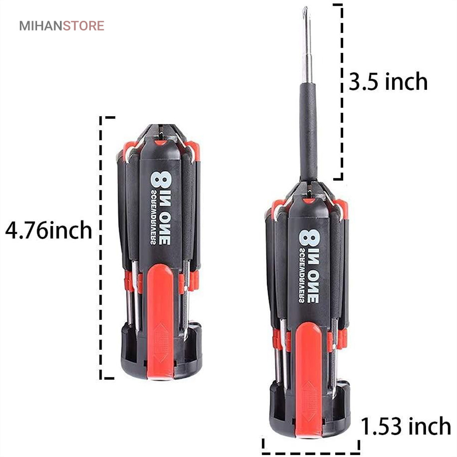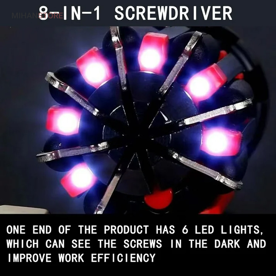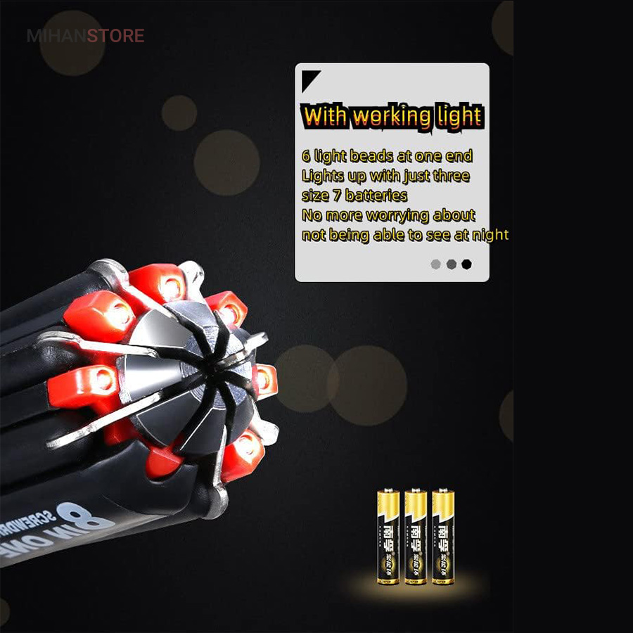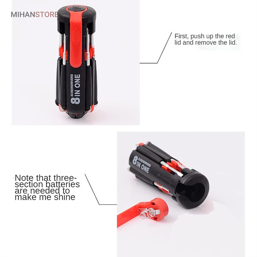 یک پیچ گوشتی به جای 8 پیچ گوشتی ، هشت پیچ گوشتی همه کاره .  پیچ گوشتی چند کاره و چراغ دار . نوع درجه یک ،  قابل استفاده داخل اتومبیل ، منزل و محل کار با 8 سر متفاوت مناسب برای تمام کارهای فنی . این پیچ گوشتی چراغ دار از جدید ترین و مناسب ترین پیچ گوشتی ها بوده که تابحال وارد بازار شده که به جای استفاده از 8 پیچ گوشتی شما می توانید از یک پیچ گوشتی 8 سر استفاده کنید.این پیچ گوشتی قابل حمل ، بدون نیاز به جعبه می باشد. پیچ گوشتی 8 سر جادویی چراغ دار قابل استفاده در محیطهای تاریک.پیچ گوشتی چند کاره و چراغ دار به همراه چراغ قوه برای کار کردن در محیط های تاریک نیز مناسب می باشد.
