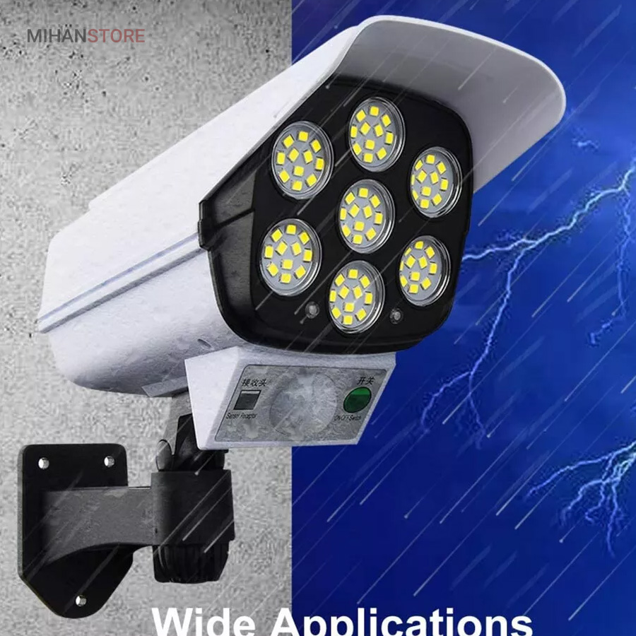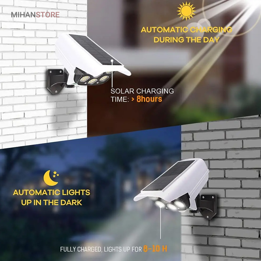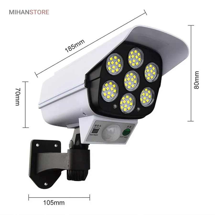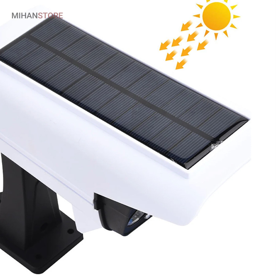 پروژکتور های خورشیدی طرح دوربین مدار بسته پروژکتور هایی هستند که حالت سیکوریتی دارند و حدودا بین 180 تا 200 وات نور تولید می کنند و شامل دو باتری لیتیومی 3.7 ولتی و پنل 3 واتی بزرگ هستند. دوربین های به کار رفته در این پروژکتور ها 2 باتری هستند و کیفیت بالاتری دارند در صورتی که دوربین های موجود در بازار به صورت تک باتری نیز وجود دارد. توانایی تابش 360 درجه دارند و پایه دارند. این نوع پروژکتور ها حتما باید زیر آفتاب باشند ولی در سایه نیز می توانند کار کنند اما نوری که ایجاد می کنند کمتر است و بازدهی کمتری دارند در این صورت باتری زودتر خراب می شود. بهتر است از این نوع پروژکتور ها در مکان های پر تردد استفاده شود. نور بسیار خوبی دارند و ارتفاع نصب آن ها بهتر است که بیش از 3 متر نباشد چرا که اگر سنسور PRD در ارتفاع بیش از 3 متر قرار گیرد حساسیت خود را از دست می دهد و قابلیتی که باید داشته باشد را ندارد. از روی پنل در این پروژکتور ها می توان متوجه خاموش یا روشن بودن آن شد به این صورت که مدار هایی درون آن وجود دارد که با تغییر ولتاژ از پنل و صفر شدن پنل، شب شدن یا تاریک شدن تشخیص داده می شود یعنی سنسور پتانسیلی دارند و همچنین دارای ریموت هستند. این نوع از پروژکتور ها را می توان زمان بندی کرد. این پروژکتور ها از پر فروش ترین جنس ها هستند.این یک لامپ دیواری خورشیدی با طراحی ظاهری دوربین مداربسته شبیه سازی است که می تواند در مکان های مختلف مانند دروازه ، راهرو ، حیاط و غیره نصب شود.