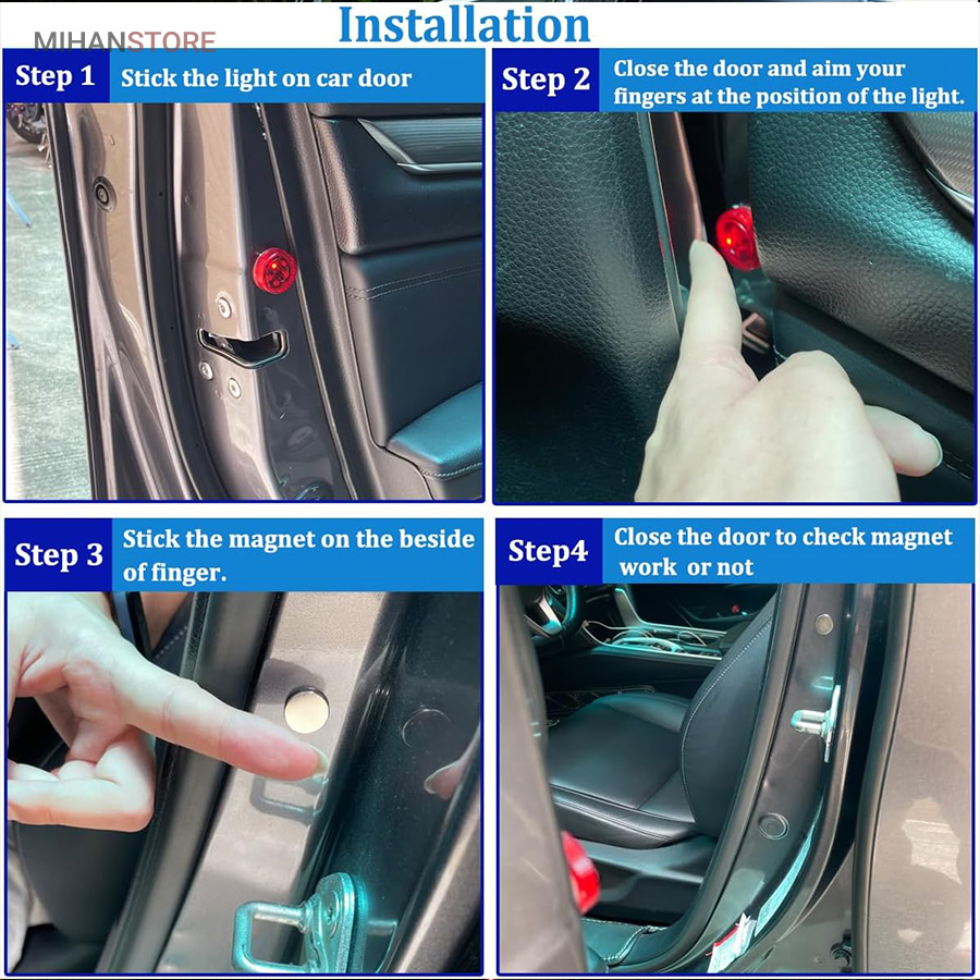 آموزش نصب: ابتدا باید چراغ را روی قسمت درب خودرو با استفاده از چسبی که روی چراغ تعبیه شده است نصب کنید که زمانی که درب خودرو باز شود این چراغ به طور کامل دیده شود. همراه چراغ ها دو عدد صفحه مغناطیسی نیز ارائه شده است که این صفحه ها باید لای بدنه خودرو به گونه‌ای نصب گردد که زمانی که درب خودرو بسته می شود، دقیقاً چراغ مقابل صفحه مغناطیسی قرار بگیرد.
