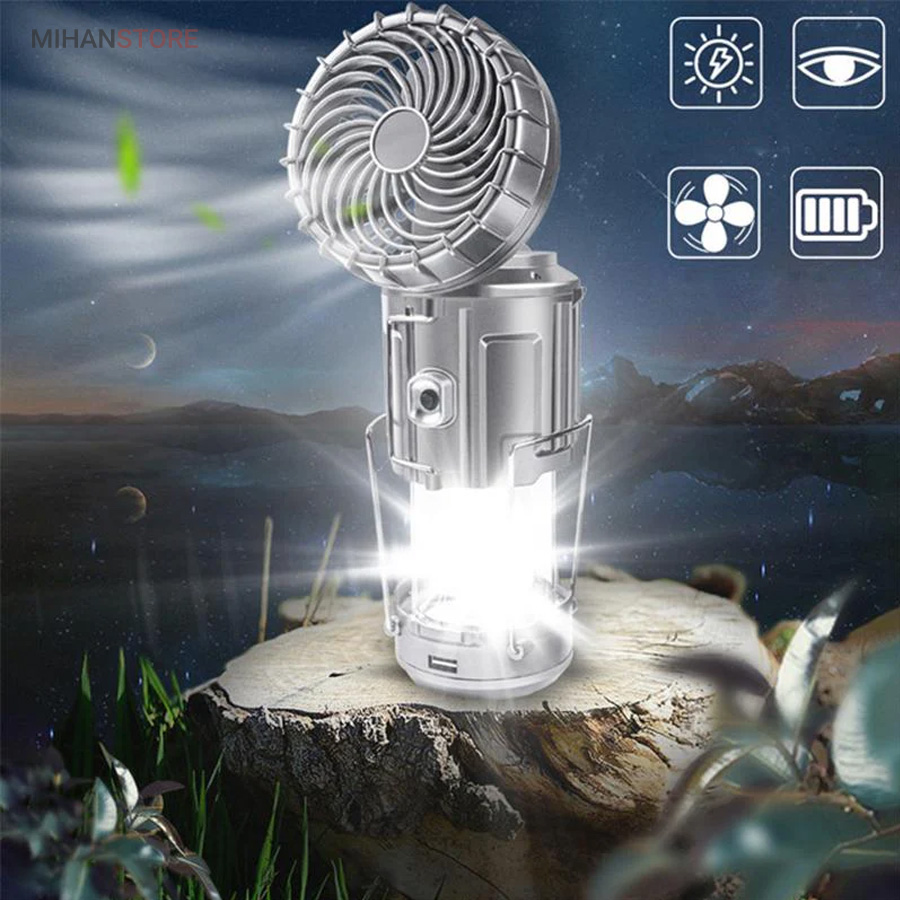 چراغ کمپینگ خورشیدی دارای پنکه و پاوربانک محصولی ساده درعین‌حال کاربردی است که می‌تواند در زمان سفر یا در شرایط اضطراری در شهر مورد استفاده قرار گیرد. در قسمت بالایی این فانوس، دو دسته‌ی فلزی قرار دارد؛ به همین دلیل می‌توان آن را داخل چادر یا هر سطح برجسته‌ای آویزان کرد و از نور آن بهره برد. چراغ کمپینگ و پاوربانک خورشیدی چندکاره همراه خوبی برای سفر به طبیعت، کوه‌نوردی و پیاده‌روی در هنگام شب هستند. گاهی ما به مکانی سفر می‌کنیم که نور کافی در آن وجود ندارد؛ در این صورت، داشتن یک لامپ فانوسی بسیار ضروری به نظر می‌رسد. همچنین از لامپ آن به‌صورت کشویی استفاده خواهید کرد و در صورت نیاز می‌توانید آن را باز کرده، به‌راحتی از روشنایی این لامپ فانوسی بهره‌مند شده و محیط پیرامون خود را روشن کنید. چراغ کمپینگ و پاوربانک خورشیدی چندکاره انتخابی خوب و باکیفیت برای داشتن سفری خوش است که می‌توانید از آن برای روشن‌کردن چادر، اتومبیل یا هر محیط تاریک دیگری استفاده کنید.