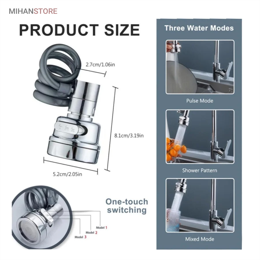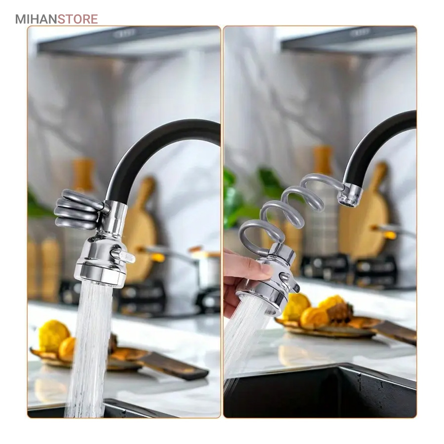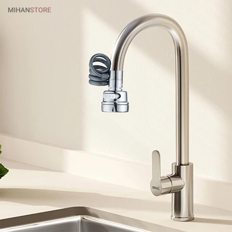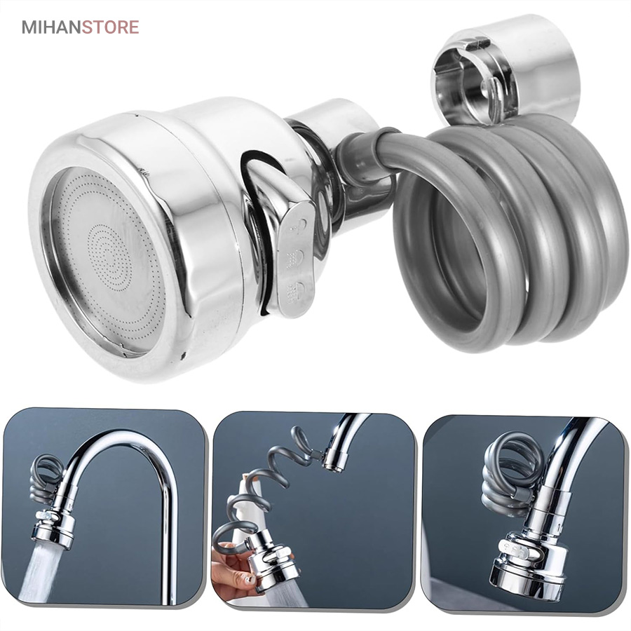 با قابلیت چرخش وسیع 360 درجه به وسیله شلنگ فنری و مجهز به 3 حالت پخش آب، قادر است بطور کامل در تمام جهات بچرخد، تا به هر نقطه‌ای از سینک یا روشویی دسترسی پیدا کند و امکان شستشوی راحت را بدهد. این سر شیر آب، با استفاده از ترکیبی از مواد باکیفیت و پلاستیک ABS، عمر طولانی و دوام بی‌نظیری دارد. نکته: سایز قطر این سری شیر آب برای تمامی شیرهای روشویی و آشپزخانه رایج بازار ایران مناسب می‌باشد. با باز کردن صفحه استیل سری شیر امکان تمیزکردن آن میسر می شود.