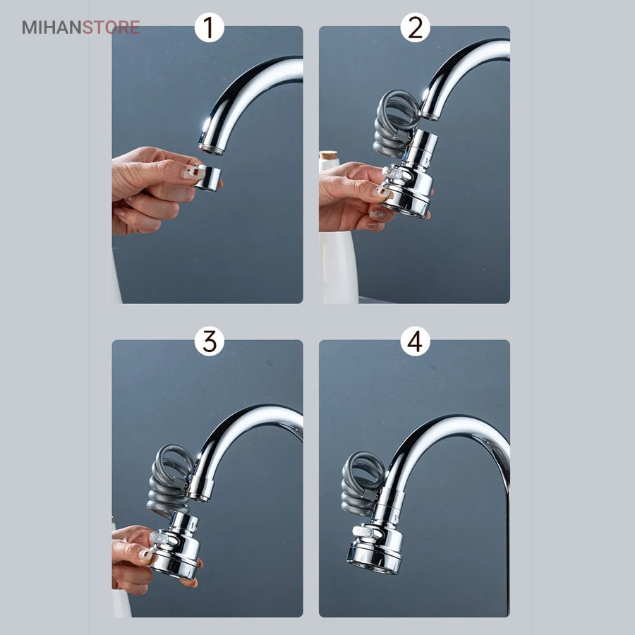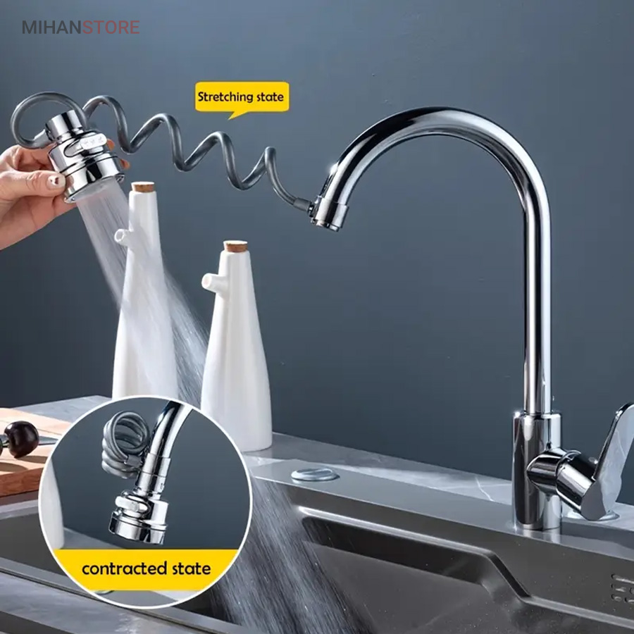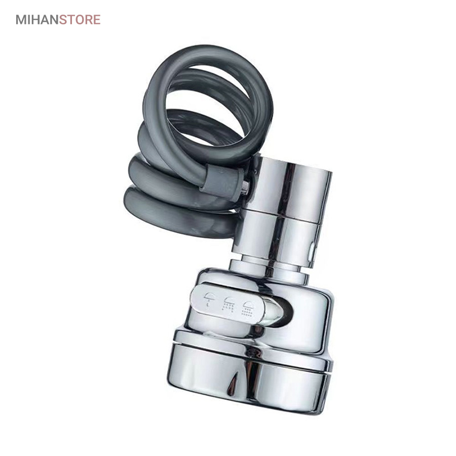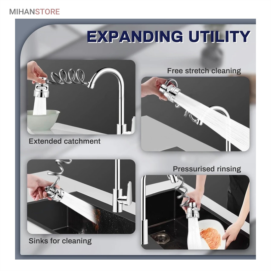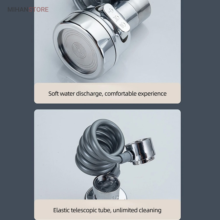 با قابلیت چرخش وسیع 360 درجه به وسیله شلنگ فنری و مجهز به 3 حالت پخش آب، قادر است بطور کامل در تمام جهات بچرخد، تا به هر نقطه‌ای از سینک یا روشویی دسترسی پیدا کند و امکان شستشوی راحت را بدهد. این سر شیر آب، با استفاده از ترکیبی از مواد باکیفیت و پلاستیک ABS، عمر طولانی و دوام بی‌نظیری دارد. نکته: سایز قطر این سری شیر آب برای تمامی شیرهای روشویی و آشپزخانه رایج بازار ایران مناسب می‌باشد. با باز کردن صفحه استیل سری شیر امکان تمیزکردن آن میسر می شود.