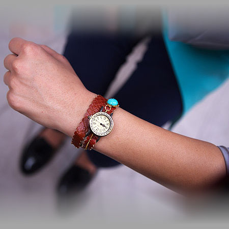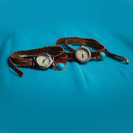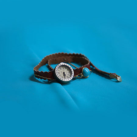 بند این ساعت، اولین نکته است که جلب توجه میکند. بندی غیر معمول که به یقین با بندهای رایج و معمول در بازارمتفاوت بوده و بصورت زیبا و دورپیچ بر روی دست، خود نمایی میکند. در وسط این بند یک سنگ فیروزه نیز قرار داده شده است.