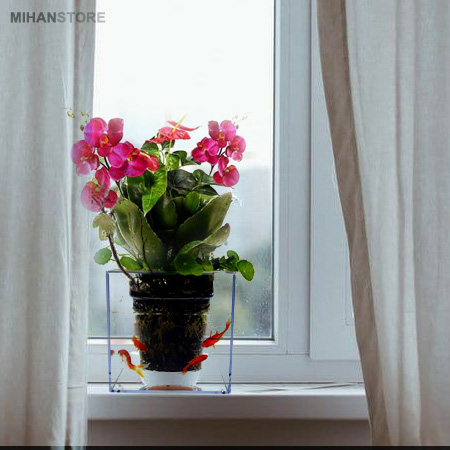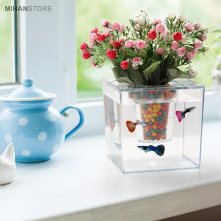 گلدان آکواریومی از سری لوازم تزئینی لوکس و مدرن است که امکان نگهداری انواع گیاه و آبزیان را به صورت همزمان در یک جا فراهم می کند. این آکواریوم دارای یک استند برای نگهداری گلدان است که می توانید گل های زینتی ، سبزه ، کاکاتوس و . . . را بر روی آکواریوم خود داشته باشید. بدنه این آکواریوم از جنس اکرولیک شفاف می باشد و با قرار دادن گلدان داخل محفظه تعبیه شده این گونه به نظر میرسد که گلدان در میان آب و ماهی های آکواریوم به صورت شناور قرار گرفته است و ماهی ها می توانند به سادگی اطراف گلدان حرکت کنند.