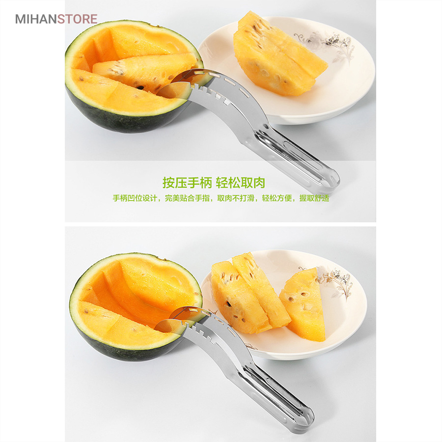 شکل ظاهری این اسلایسر شبیه به داس بوده و مانند یک انبر کنار همدیگر قرار گیرفته و همانطور که اشاره شد در انتهای آن یک تکه فلز یا تیغه به هم متصل شده تا در حین برش کاملا یک دست و یک شکل شود.  از این اسلایسر هندوانه می توانید در سفر هم استفاده کنید. ابعاد در نظر گرفته شده برای برش زن هندوانه 25 × 5 سانتی متر است.  وزن سبک، شست و شوی راحت و آسان از دیگر مزیت های این لوازم آشپزخانه کاربردی محسوب می شود.