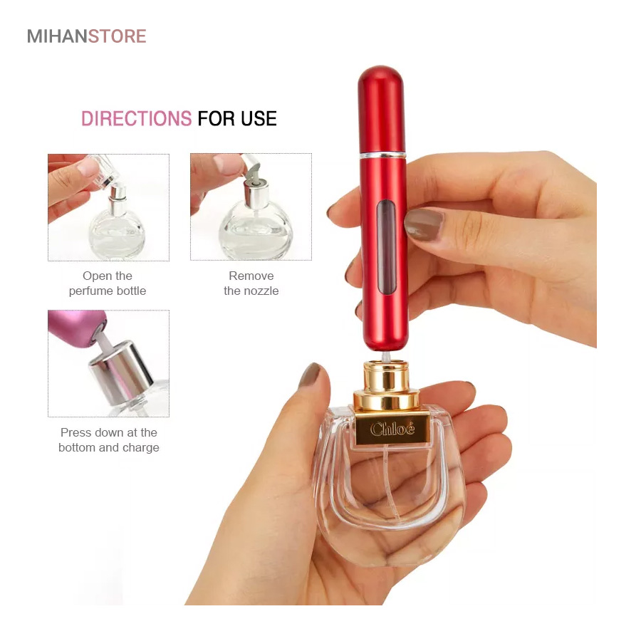 حتما برای شما هم پیش اومده که میخواید ادکلنتون همیشه همراهتون باشه ولی به دلیل حجم زیاد و سنگین بودن شیشه از اینکار منصرف میشید.این اتومایزر چاره کار شماست. به راحتی قابل شارژ و استفاده در همه جا هست. به سادگی قسمت اسپری شیشه عطر یا ادکلن خود رو برداشته و اتومایز عطر را از انتها بر روی شیشه ادکلن قرار داده و چند مرتبه فشار دهید تا مخرن آن به مقدار دلخواه شارژ شود. این محفظه نگهدارنده عطر جیبی علاوه بر سبکی مقاومت بسیار خوبی دارد و کیفیت آن به گونه ای است که هیچ گونه نشتی و هدررفت ادکلن و عطر در هنگام شارژ و یا حمل بطری عطر نخواهید داشت. حجم محفظه این اتومایزر 5 میلی لیتر است. محفظه نگهدارنده عطر اتومایزر مدل DR مناسب برای کسانی است که علاقه مند به همراه داشتن همیشگی عطر های خود هستند، با خرید یک بار از این محصول تا هر زمان که تمایل به مصرف عطرهای خود به صورت جیبی و قابل حمل داشته باشید، میتوانید استفاده نامحدود کنید. این وسیله فاقد عطر است و باید توسط شما با عطرهای شخصی خود پر شود این محصول در سفر های درون شهری و برون شهری قابل استفاده است و دیگر نیازی به حمل کل ظرف پرفیوم و عطر خود ندارید در نتیجه احتمال شکستن یا از بین رفتن ظرف اصلی پرفیوم شما صفر خواهد شد. نحوه پرشدن این محصول مشابه با پر کردن گاز فندک است.قسمت زیرین اتومایزر با ظرف پرفیوم است و به صورت تلمبه ای پر خواهد شد.