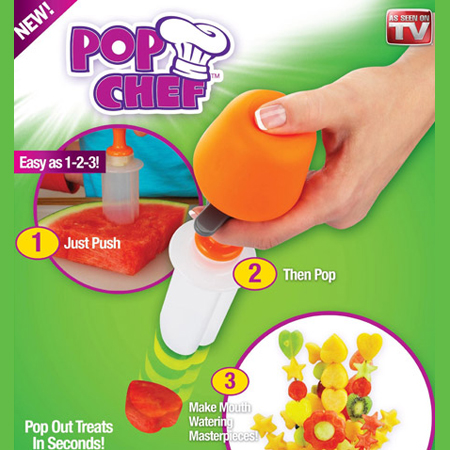 به وسیله قالب میوه پاپ چف شما می توانید میوه ها و خوراکی ها را به اشکال مختلف در آورده و از خوردن آنها لذت بیشتری ببرید. پاپ چف یک وسیله ساده و کارآمد است که شما را قادر میسازد در کمتر از چند ثانیه و در 3 حرکت میوه ها و خوراکی ها را به شکلهای مختلف و با ضخامت های مختلف درآوید. فقط کافیست قالب را بر روی میوه بفشارید و مخزن هوا را به قالب وصل کرده و فشار دهید تا خوراکی هایی با اشکال زیبا و خوشمزه داشته باشید و از خوردن آنها لذت ببرید. از پاپ چف می توانید برای تزئین‬‎ میوه، کیک و شیرینی های مختلف استفاده کنید.