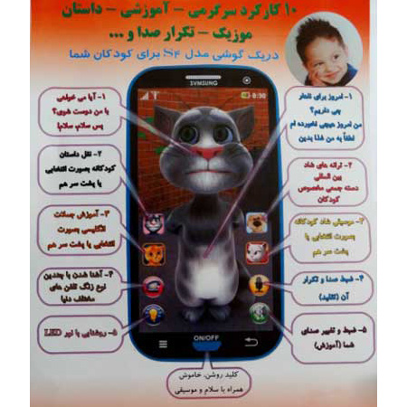 این گوشی نه تنها برای سرگرمی می باشد بلکه وسیله ای آموزشی برای کودک شما هست. این موبایل لمسی در حافظه خود دارای آموزش زبان انگلیسی، ضبط و تکرار کلمه، چراغ قوه، منو تفریحی مثل زنگ، سخنگوی خنده دار گربه و ... می باشد. همچنین این گوشی دارای امکان لمس گربه میباشد که با لمس قسمتهای مختلف گربه صداش رو، رو سر خود میذاره و شما رو میخندونه ...